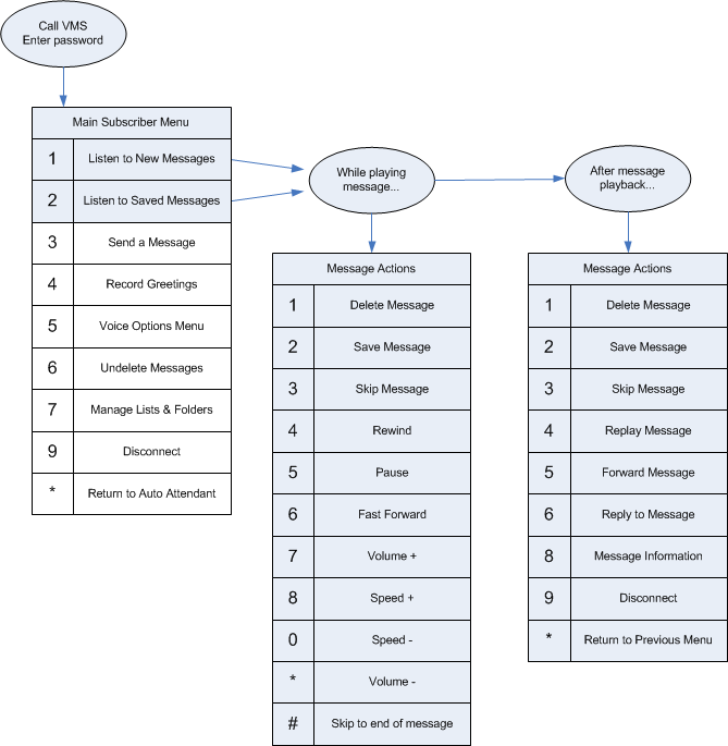 | Message information | 8 | Plays a detailed history of where the message came from and when it arrived. For messages from outside callers, the caller ID may be played if it is available, otherwise the system will just say that it was from an outside caller. Forwarded messages include information about when the original message was recorded. |