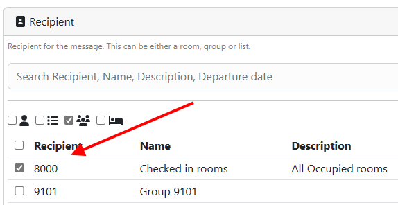 In this example we will be sending the message to all checked in rooms. This group has been automatically populated for us by the hospitality server.