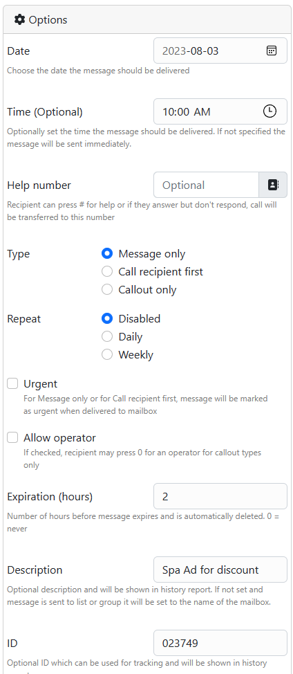 | Repeat | Optionally choose to repeat this message. |