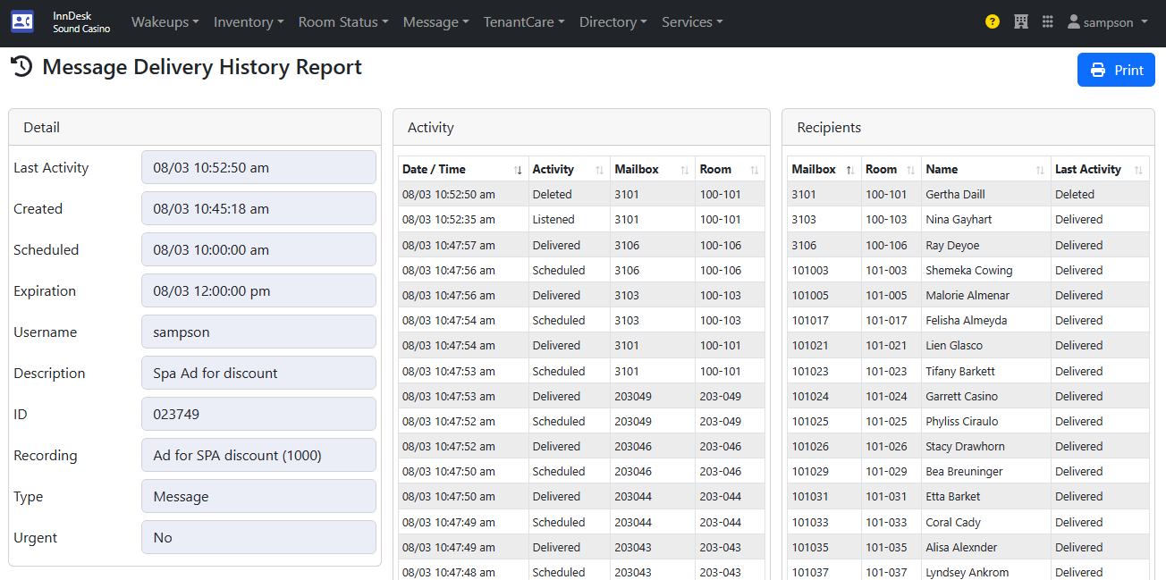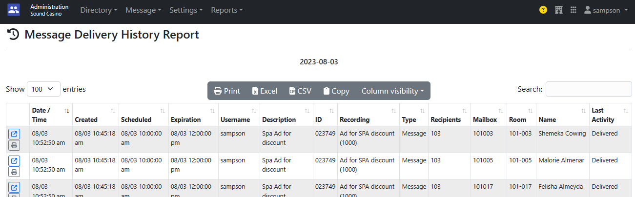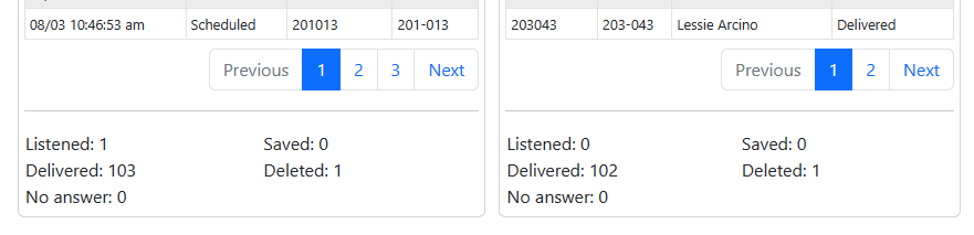 Here you can see all the activity performed on the message. For example you can see mailbox 3101 room 100-101 listened to the message and deleted it.
