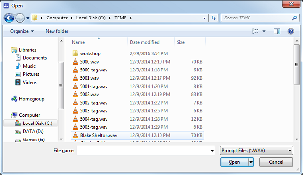 Select the file(s) to import and click Open to import all selected files into the selected mailbox. You will return to the Prompt Selection dialog, which will now display the files you imported, in addition to any greeting files already in the mailbox.