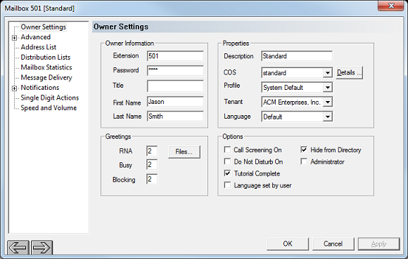 To install a professionally-recorded mailbox greeting, you can either manually copy the files into the folder for the selected mailbox, or you can use Mailbox Administration to import the recording for you; we recommend using the latter method. To do so, double-click on the mailbox in Mailbox Administration to open the Mailbox Editor. Select the Owner Settings property page, as shown below: