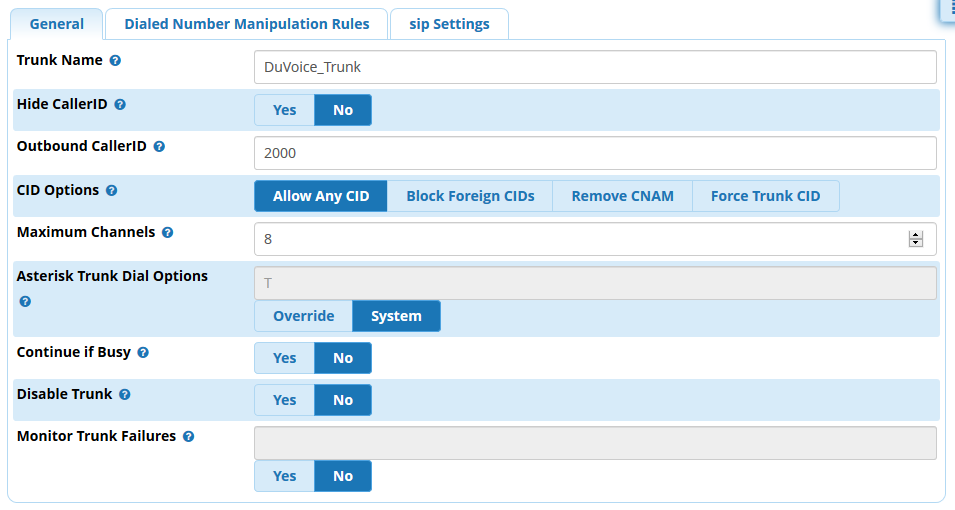 In this example the DuVoice system is located at IP address 192.168.100.101 and we will be using 2000 as our trunk extension.