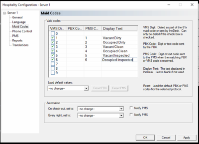 NOTE: The Opera PMS system is the determining factor of the maid codes. The DuVoice system has to match what's configured on the Opera server. Below are the defaults for Opera, but will most likely be different for each property.