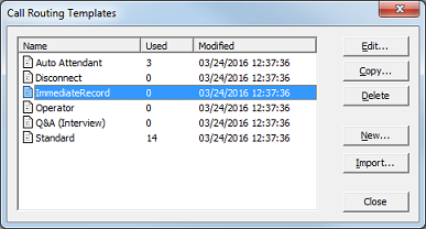 The figure above shows the Template Manager opened for managing call routing templates. The only real difference when managing any other template type is what is displayed in the title bar; it will always display a label that identifies the type of template being managed.