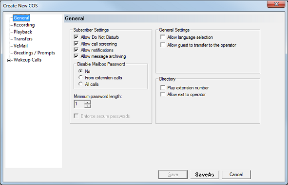 These settings enable or disable features that appear as options in the subscriber menu, as well as password-related settings. They are only voiced (and available) to the subscriber if they are enabled here.