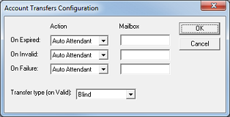| Transfer | Transfers to the specified mailbox. If no mailbox is specified, then the current mailbox extension is used. This is the same as if the account ID was valid. |