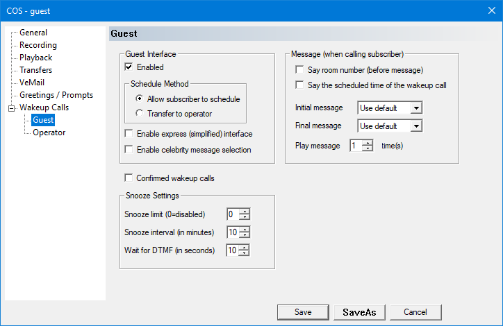 | Enabled | If checked, the option to schedule a wakeup call will be voiced in the subscriber menu (but only if the mailbox is of type guest). If not checked, the wakeup call option will not be available in the guest subscriber menu, however the wakeup calls can still be scheduled by the PMS or by the administrator (via InnDesk). |
