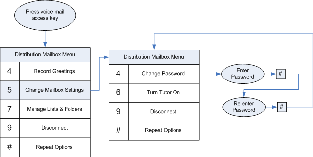 Distribution mailboxes have two settings you can change–your password and the tutorial setting–as shown in the flowchart below.