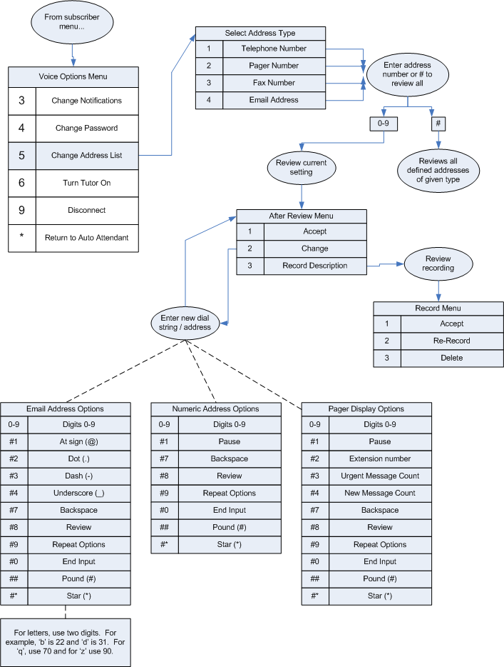 The process for entering an email address is necessarily a bit more cumbersome. In order to allow you to enter alphabetic characters, the system requires two keypresses for each character dialed, based on the standard telephone keypad. Thus, to enter the letter 'A', you must press the digits 21. To enter a letter 'B', press 22. And so forth. Since the letters 'Q' and 'Z' are not always marked on the keypad, use 70 for 'Q' and 90 for 'Z'. To enter a number 0-9, press the corresponding digit and then press #.