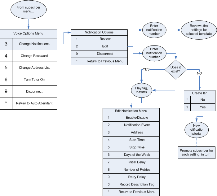 This option allows you to modify your custom notification templates, if allowed by your class of service (global templates can only be edited by the administrator). The following flowchart gives a brief overview of this process.