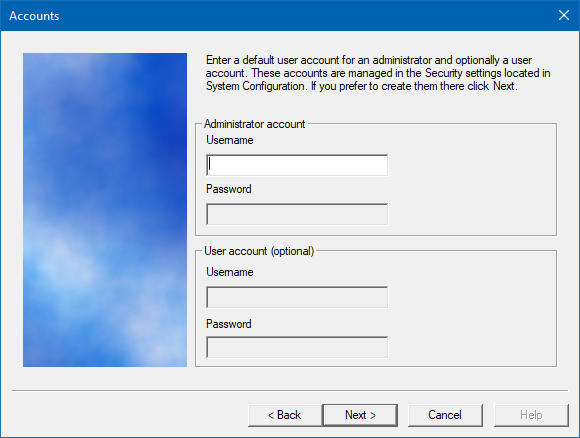 Create an initial administrator account. Optionally also create a standard user account for accessing InnDesk or other web based interfaces. This option can be skipped, if necessary and completed within System Configuration. For additional security some words cannot be used for account names. When finished, click Next to continue.