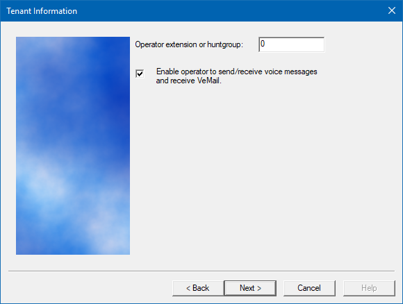 On the Tenant Information page, enter the extension or hunt group number for the operator; the default is 0. If you would like the operator to have a mailbox for receiving messages, check the box provided. When finished, click Next to continue.