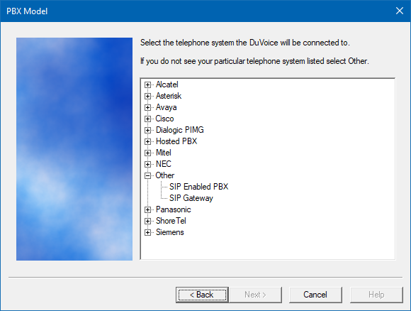 On the PBX Model page, select the PBX integration to use. If your model is not listed, you can just select Other | SIP Enabled PBX for now. The PBX model can be changed later in System Configuration if necessary. Select a PBX and then click Next to continue.