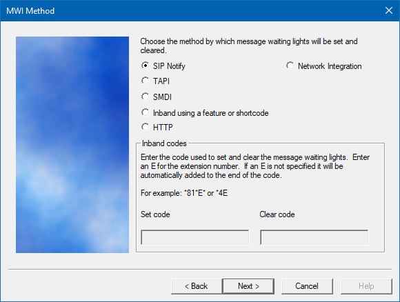 On the MWI Method page, select the method or protocol to use when sending MWI codes to the PBX. If you selected a PBX on the previous page for which the available methods are known, only those methods will be selectable and the others will be disabled. However, if you selected Other | SIP Enabled PBX (as in the example above), all options will be available and it is left to you to know the correct choice for your PBX.