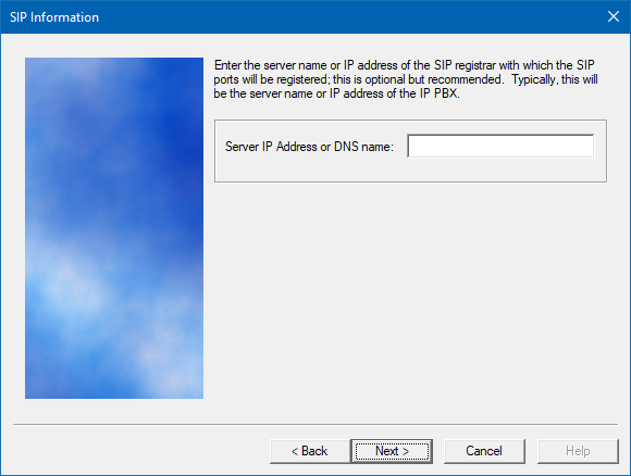 On the SIP Information page, enter the IP address or DNS name for the PBX in the box provided. Click Next to continue.