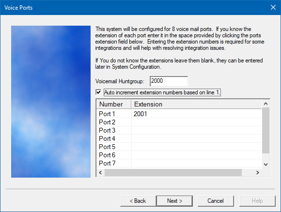 If the extension numbers are in numeric order starting at port 1, you can just enter the extension for port 1 and then check the Auto increment extension numbers based on line 1 box and the wizard will auto-generate the remaining port extensions (they will be displayed on the next page for your review). You may also enter a voicemail hunt group number in the box provided.