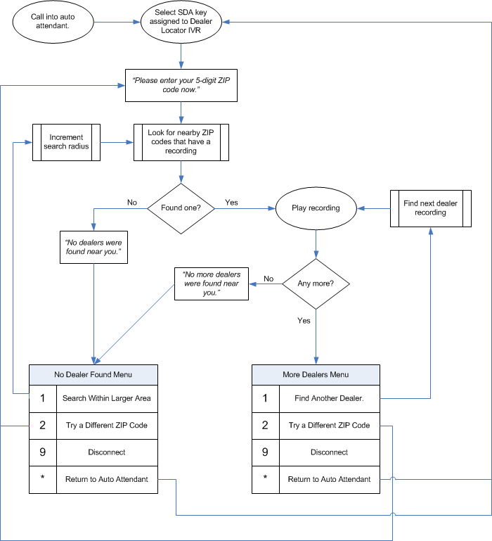The Dealer Locator IVR application allows callers to access pre-recorded information (such as the address and phone number) for dealers located near them by entering their 5-digit ZIP code.