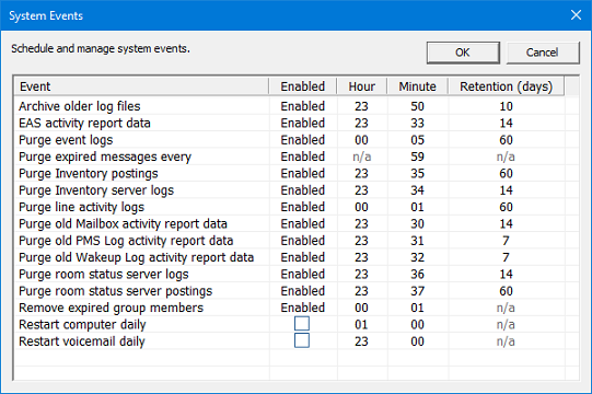 The System Events dialog allows you to schedule and manage various system tasks (such as maintenance), as shown below.
