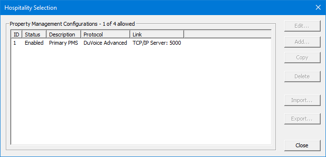 The settings accessed through System Configuration allow you to configure the serial or TCP port used by the hospitality service, specify which communication protocol to use, and configure other hospitality-related settings.