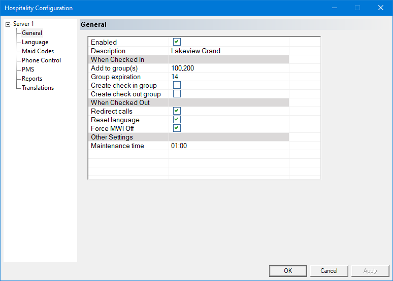 If you are using InnDesk or the telephone interface to manage a property, not a PMS, then make sure server 1 is enabled and set its connection type, on the PMS page, to None.