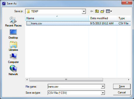 Use the Look in selection box, or the controls to the right of it, to navigate to the folder where you wish to save the file. Enter a name for the file in the File name box provided at the bottom of the dialog. If you do not enter the .CSV file extension, it will be added on for you.