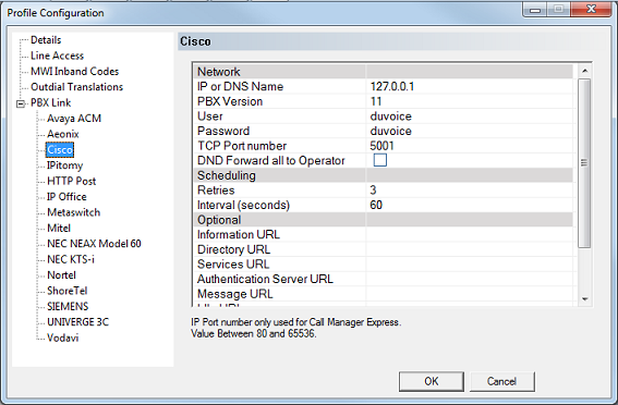 The DuVoice v7 can link to a Cisco Unified Communications Manager PBX (CUCM) using a TCP connection where the PBX is the server. This link uses the protocol and features listed in the table below: