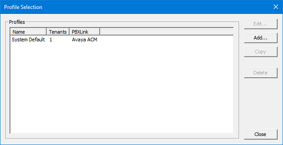 A system may have have an unlimited number of profiles. When you select the Site | Profiles menu option, the Prompt Selection dialog will be displayed. From here, you can select a profile to edit, copy or delete, or you can add a new profile. For convenient reference, the selection table lists not only the profile name but also the assigned PMS Link ID and the number of mailboxes assigned the given profile.