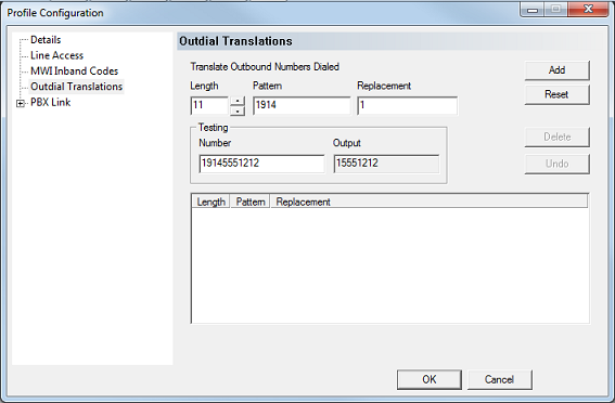 To test your translation before adding it to the table, enter a matching number in the Number field. If it matches both the Length and Pattern values you entered, the resulting translation will be automatically displayed in the Output field. If nothing is displayed there, then the number you entered did not match.