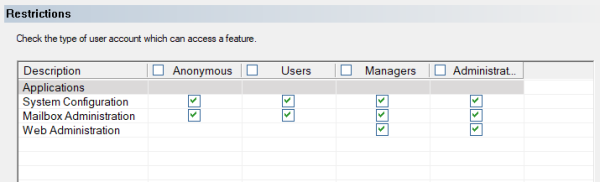 | Web Administration | Web-based administration. If this is blocked only the desktop application Mailbox Administration can be used. |