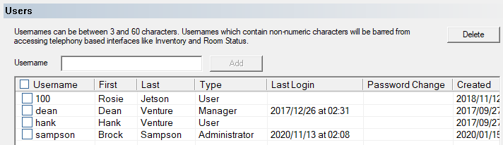 This page allows you to add, edit and delete administrative user accounts. These accounts may be used to access InnDesk, Mailbox Administration, and/or System Configuration, depending on the configuration of access restrictions on the Restrictions page.