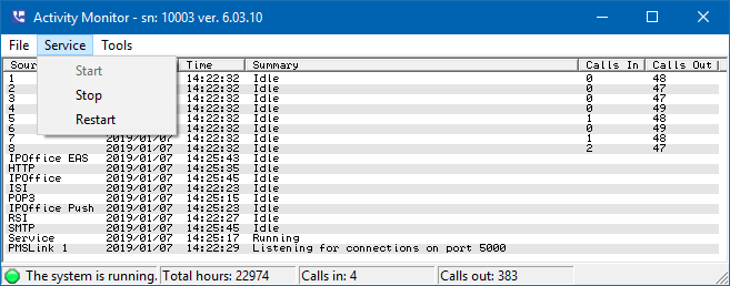 The main use for Activity Monitor is to start and stop the 7.00 service itself. These options are accessed by selecting Service from the menu, as shown in the figure below: