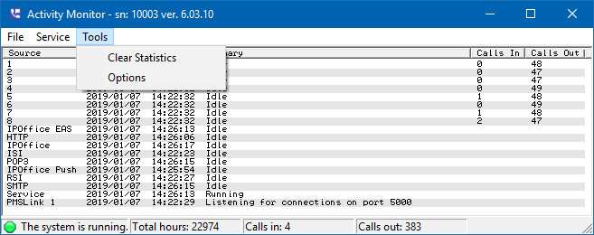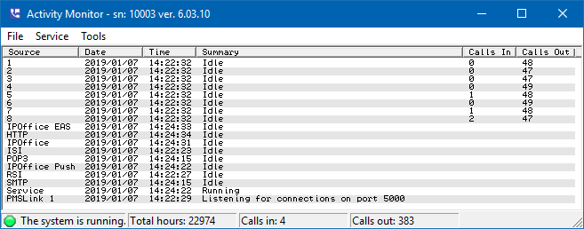 The Activity Monitor utility, as shown below, displays the current status of all voice lines that have been loaded, as well as the various services managed by the main 7.00 service. It also displays three statistics in the status bar along the bottom of the dialog: the approximate amount of recording space remaining, expressed in hours; the total number of calls received since the system was started; and the total number of outbound calls made since the system was started.