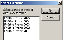 Once you have connected to the PBX, right-click anywhere on the grid and select Open device(s). This will open the Select Extension dialog, shown below, which allows you to select the extensions or devices you wish to monitor. Note that how extensions and devices are listed in the dialog will differ depending on the PBX type.