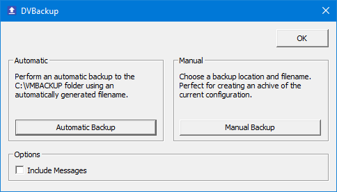 - Choose Manual Backup and select a file name and location you can remember. We suggest C:\VMBACKUP\predbupgrade.vmb.