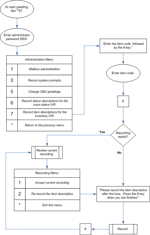 The Inventory Status Interface (ISI) provides an administrator telephony interface for recording item descriptions that is integrated with the standard administrator telephony interface for the voicemail / auto-attendant system. The flowchart below provides a basic overview of how to access and use this interface to record item names or descriptions.