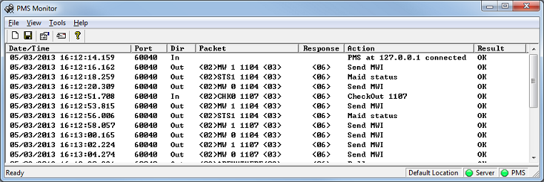 | Packet | The raw packet or control byte received, if relevant.For some entries, this may be blank. In the example above, the first line indicates that a connection with the PMS has been established. There is no actual data transferred at this point, so the Packet column is blank. |