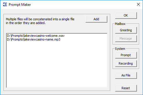Multiple files can be chosen, they will be combined together in the order they are added. In this example we have a professionally recorded WAV file which is the welcome greeting and a professionally recorded MP3 file of the hotels name.