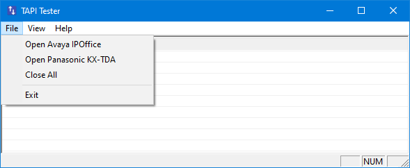 When TAPILine is initially started, it displays only a blank window. Before it can display any integration data, you must first establish a connection to the PBX. Select File from the main menu as shown in the figure below. Then select either Open Avaya IPOffice or Open Panasonic KX-TDA, depending on which PBX your system is connected to.