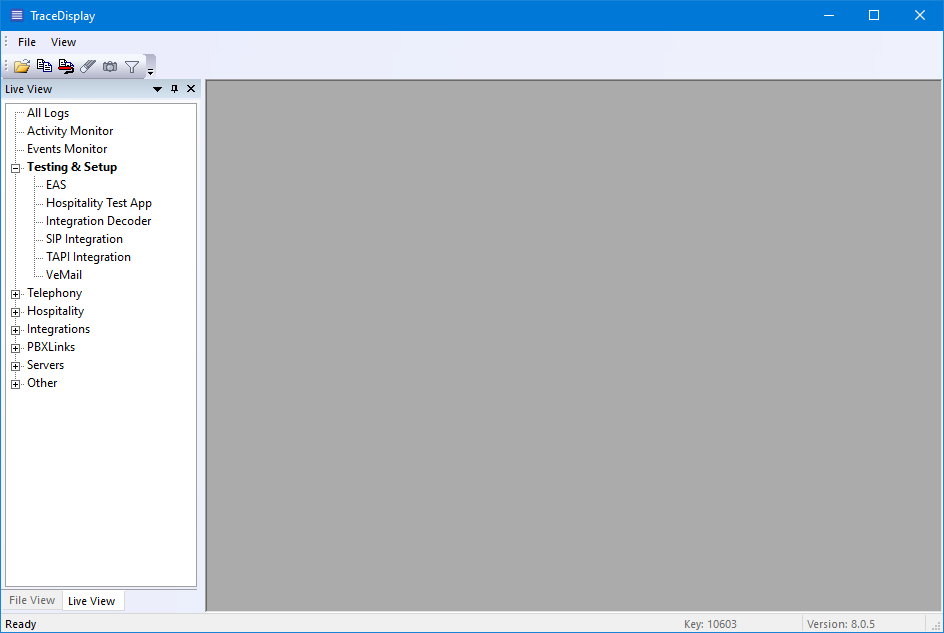 To view one or more logs in real-time, use the tree view pane on the left to select which log(s) to view. The logs are grouped in broad categories such as Telephony and Hospitality; click on the '+' or '-' symbols to expand or collapse each category. To open a log, double-click on it.