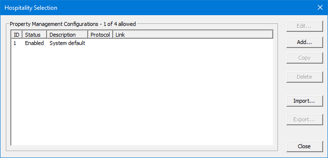 The settings accessed through System Configuration allow you to configure the serial or TCP port used by the hospitality service, specify which communication protocol to use, and configure other hospitality-related settings.