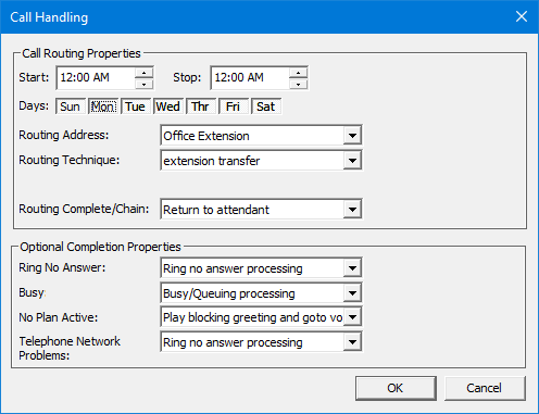 The call handling plan is used to alter how a call is processed by the system in one of two places: either at the start of the call (when the extension is first dialed) or at the end of a call (after it has been answered or not answered). One further consideration is the schedule that specifies the time period and days of the week during which the template is considered active (collectively known as the time window).