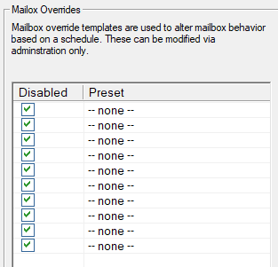 Override templates allow you to change how a mailbox operates based on a schedule. By default there are none assigned to any mailbox type.