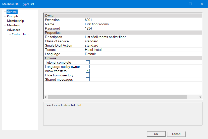 | Hide from directory | Hide mailbox from telephony directory. This should always be checked for guest mailboxes unless using the guest directory. |