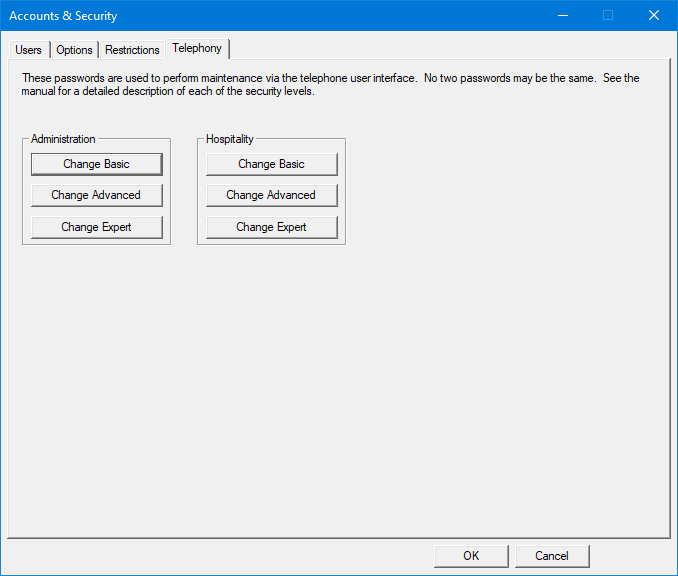 Click OK to save the new password. If your entries in the two boxes do not match, the system will warn you about it and require you to re-renter them. Also, for any of the six telephony passwords, if the password you entered is already in use for one of the other access levels then you will be required to choose a different password. All six telephony passwords must be unique.