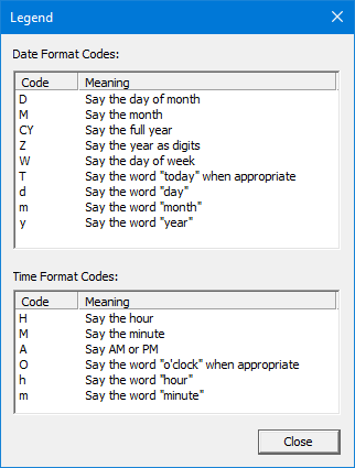 Click the Legend button to open a dialog, shown below, that displays the valid formatting codes for the Date Format and Time Format settings.