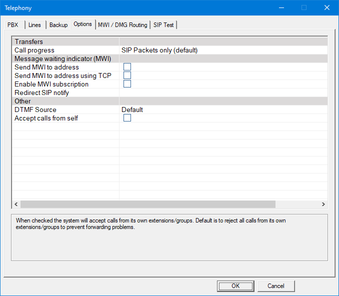 | Accept calls from self | When checked the system will accept calls from its own extensions/groups. Default is to reject all calls from its own extensions/groups to prevent forwarding problems. This helps with systems were the call forwarding ring count is less than what the DV2000 expects. For example when the DV2000 calls a station and it forwards back to the DV2000 the system will reject the call and treat it as a ring no answer. |